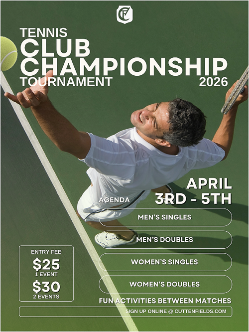 Tennis Club Championship Weekend on Friday April 3 - Sunday April 5th Times TBD.